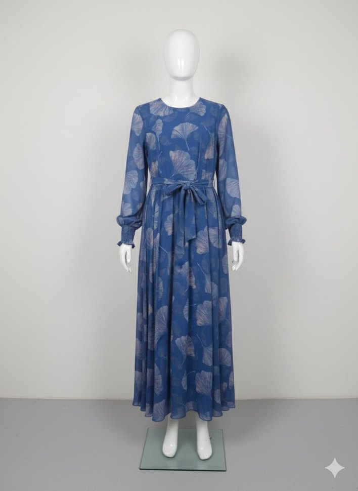 Kadın Mavi Uzun Pilili Bohem Elbise