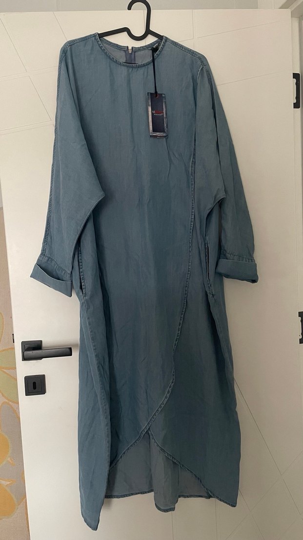 Bu kadın uzun denim elbise, salaş kesim ve drapeli tasarıma sahip, uzun kollu ve yaka detayı notched lapel. Günlük kullanıma uygun rahat stil sunar.