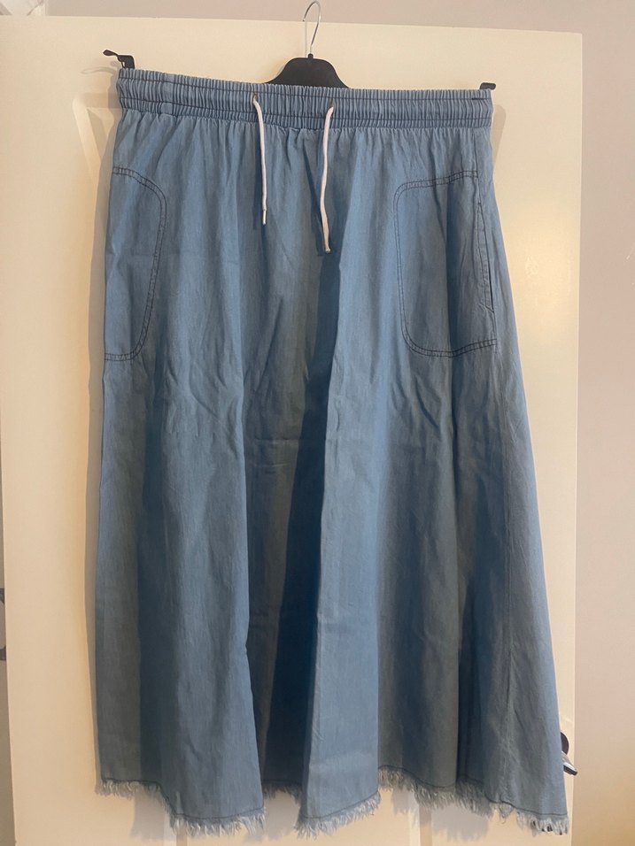 Mavi renkte, salaş kesim, drapeli detaylı tesettürede uygun uzun denim kadın eteği. Marka temsilidir.
