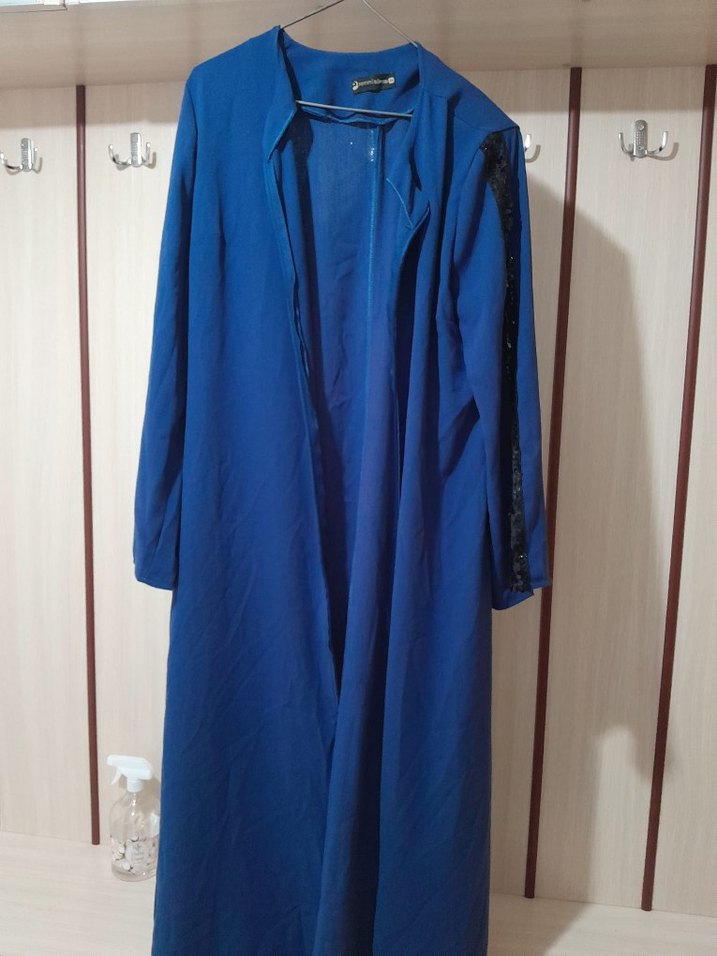 Kadınlar için uzun mavi kaban, drapeli ve notalı yaka detaylıdır. Uzun kollu, salaş kesim ve minimalist sokak modası stilindedir. Sentetik kumaştan yapılmıştır.