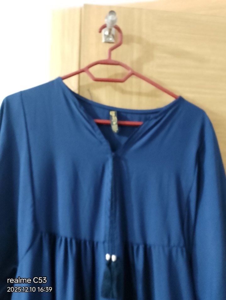 Kadınlar için mavi uzun elbise, V yaka ve uzun kollu, bol kesim ve püskül detaylıdır. Minimalist, bohem tarzda, sentetik kumaştan üretilmiştir.