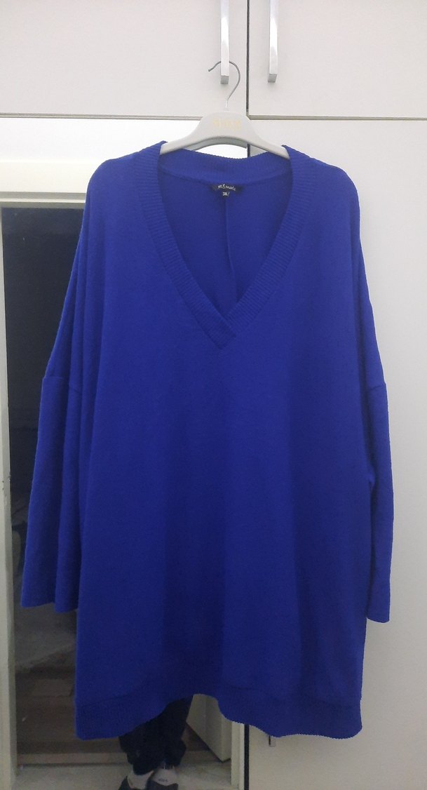 V yaka, uzun kollu, mavi renk salaş örgü kazak. Yumuşak ve sıcak kumaştan, günlük kullanıma uygun rahat ve konforlu.Salas model 3 kere kullanıldı hiçbir kusuru yırtık sökük yoktur