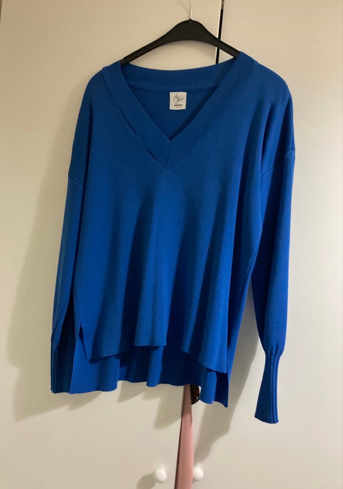 Kadın mavi V yaka, uzun kollu, bol kesim triko kazak. Örme yün kumaştan, günlük rahat kullanım için uygundur.