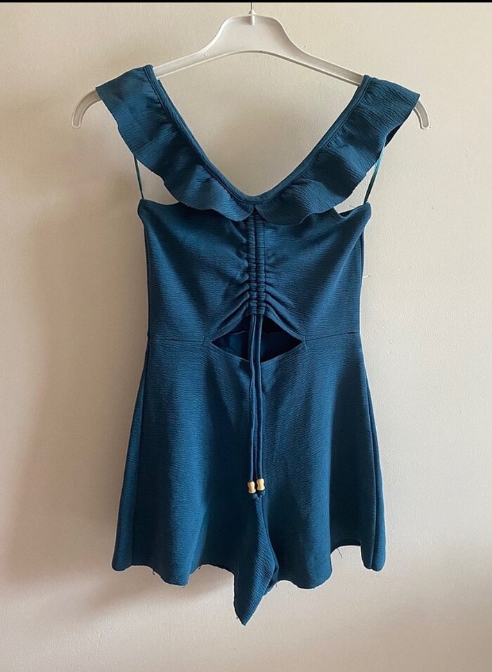 Kadın Mavi Volanlı Kısa Tulum