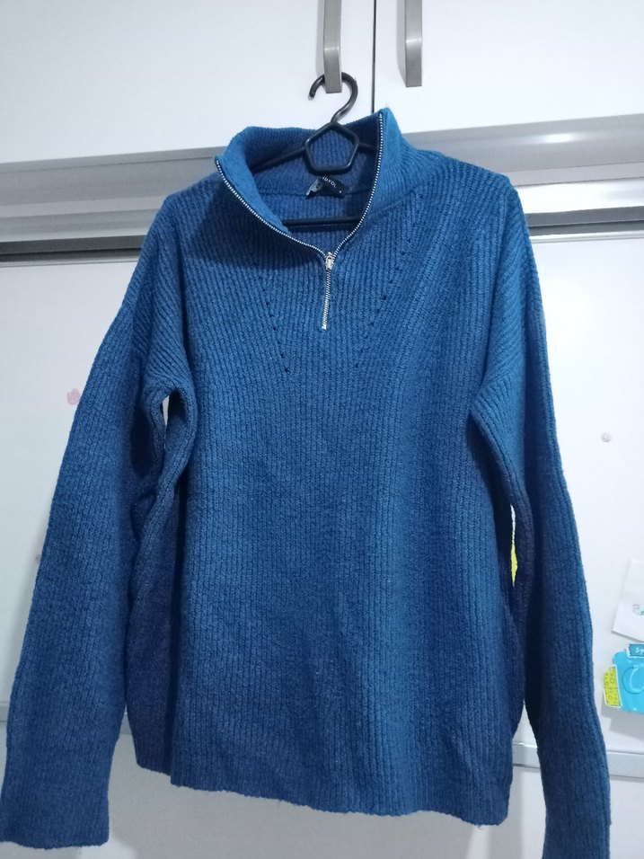 Mavi renkli, yarım fermuarlı yüksek yakalı, uzun kollu örme kazak. Rahat kesimi ve normal boyu ile günlük ve sokak stiline uygundur.