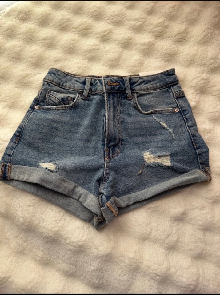 Gevşek kesim, mavi yıkamalı kadın kot şort. Kısa boy, kemerli katlanmış paçalar ve günlük sokak stili için yıpratma detaylarıyla.