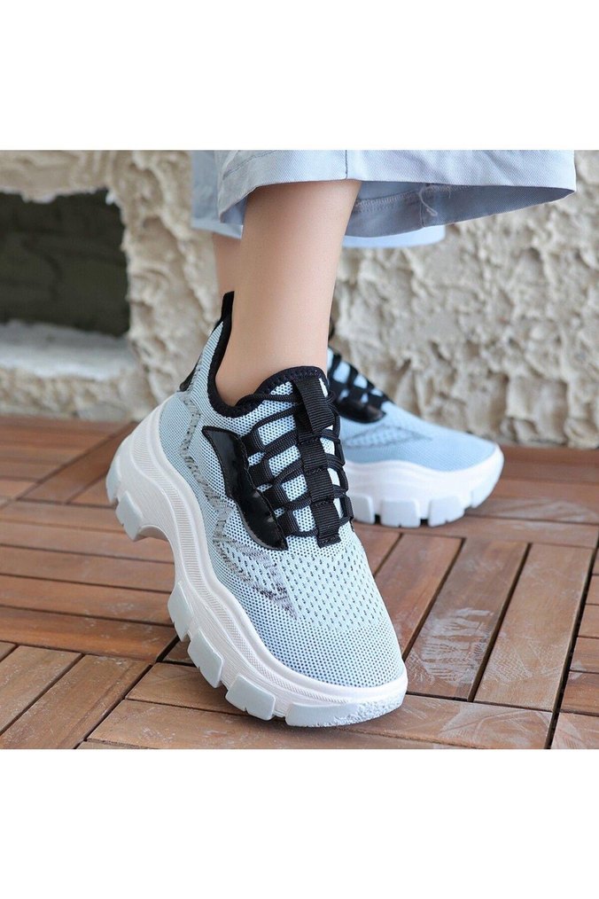 Mavi ve gri yılan desenli, bağcıklı kadın spor ayakkabısı. Platform topuklu ve kauçuk tabanlı, sokak stili ile spor rahatlığını birleştirir.teklif yollayabilirsiniz kabul ederim