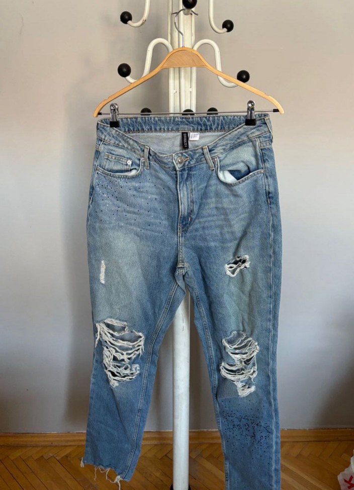 Kadın taş detayli Mavi Yırtık Bol Kesim Denim Pantolon