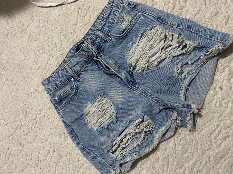 Kadınlar için bol kesim, yırtık detaylı ve tokalı bel bandına sahip mavi denim şort, grunge punk tarzında sokak modasına uygun. Günlük kullanıma uygun. hic giyilmedi