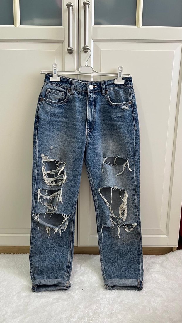 Bol kesim, yırtık detaylı, mavi-gri tonlarında kadın kot pantolon. Kemer tokasıyla tamamlanan günlük sokak stili için uygun.