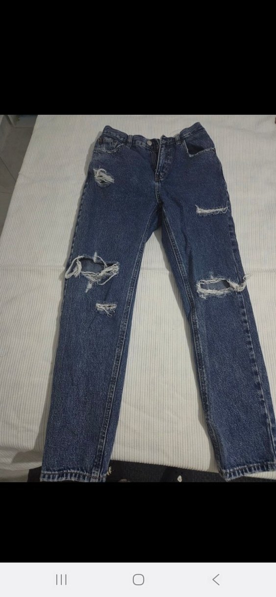 Mavi denim kadın kot pantolon, bol kesim ve yırtık detaylara sahiptir. Pantolon, sokak stili ve günlük kullanım için uygundur. beli tadilatlı ölçüleri ekledim.