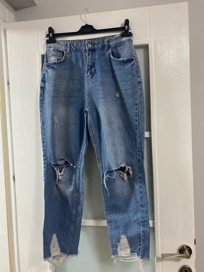 Bu kadın mavi kot pantolonlar, bol kesim ve yırtık detaylara sahip olup, paçada tokalı tasarımıyla gündelik sokak stiline uygundur.