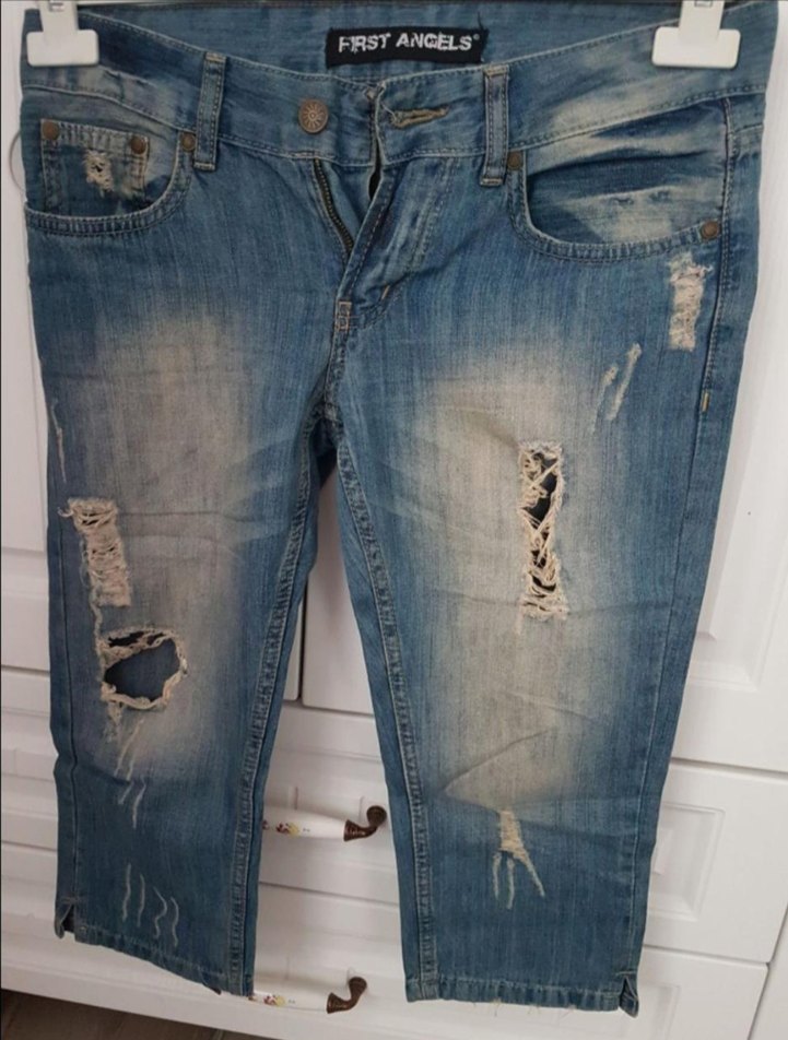 Dar kesim Capri kot pantolon, yırtık detaylı. Günlük kullanıma uygun, desen içermeyen sokak tarzı kot pantolon. Birkaç kez giyildi.
