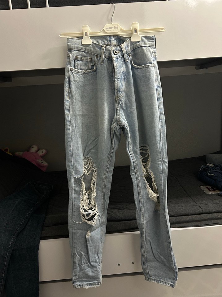 Gevşek kesim, midi boy, mavi denim jean, yırtık ve bağcıklı detaylarla sokak stili için uygun, günlük kullanıma ideal.