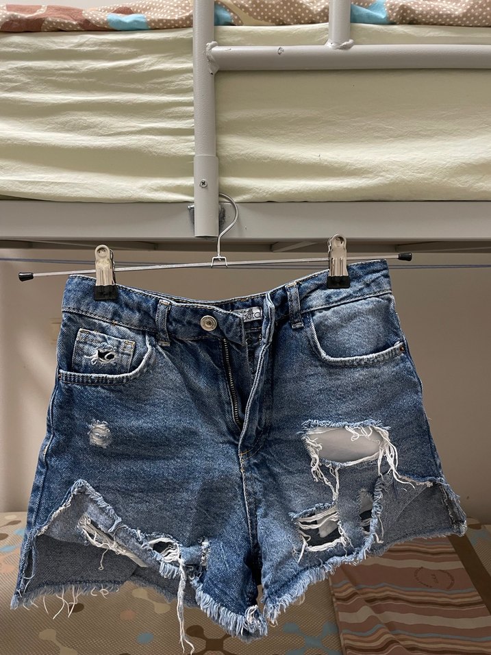 Kadınlar için bol kesim, bağlamalı detaylı, yırtık desenli mavi gri tonlarında kısa denim mini şort. Sokak stiline uygun rahat tasarım.