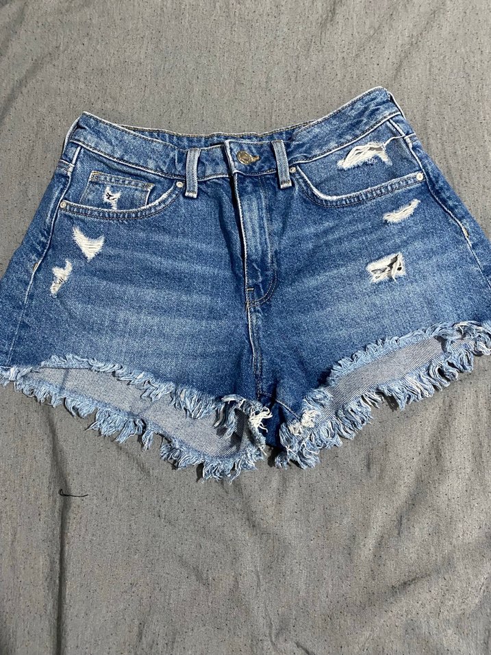Yırtık detaylı, bol kesim mavi denim mini şort. Günlük kullanım için uygun, rahat sokak stili şortu.