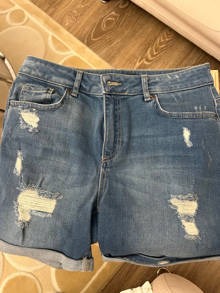 Parlak mavi renkli, bol kesim yırtık detaylı denim mini şort. Kemer tokası bulunur, günlük rahat sokak stiline uygundur. Çok az kullanılmış çok temiz rahat kalıp şort