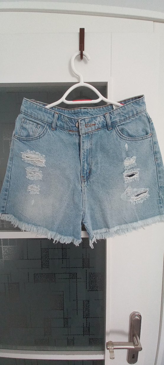 Kadınlar için yırtık detaylı, bol kesim mavi denim mini şort, günlük rahat ve trend sokak stili sunar.