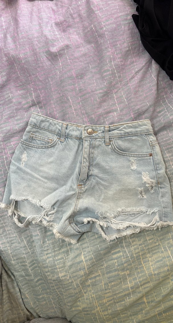 Yırtık desenli, yıpranmış detaylı, gevşek kesim mavi denim mini şort. Günlük kullanıma uygun rahat sokak stili.