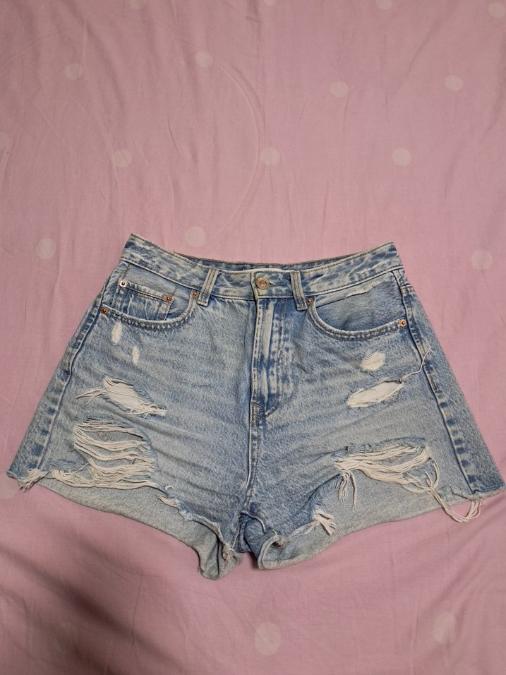 Yırtık detaylı, bol kesim mavi denim mini şort, bağcıklı tasarım ve batik desenle sokak stili. Günlük kullanıma uygun.