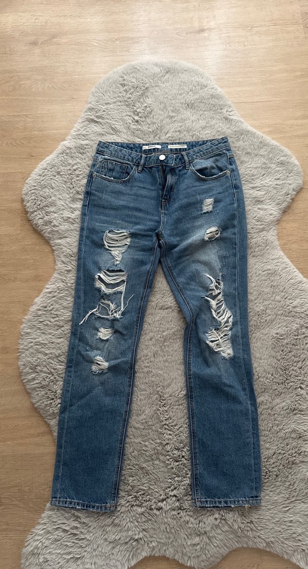 yırtık detaylı mavi kadın denim pantolon, tokalı bel kısmı ile günlük sokak stiline uygun. Hiç giyilmedi sezon ürünü bedenime uygun olmadığı için satıyorum
