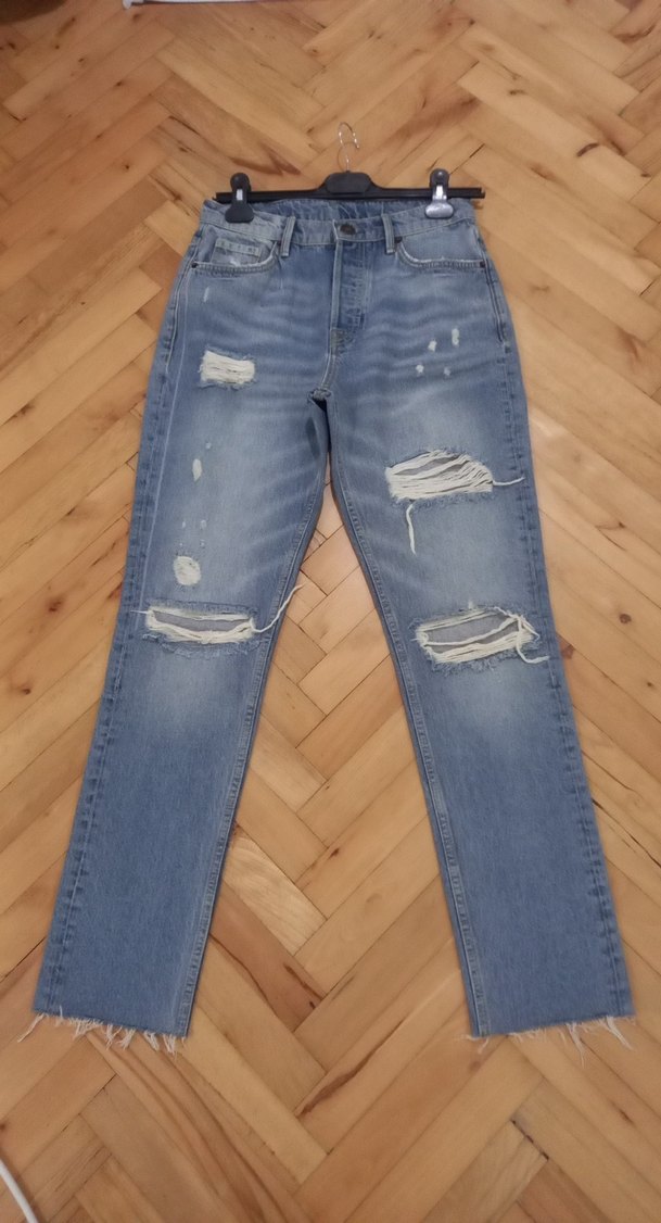 Bu regular fit, mavi denim pantolonlar, yırtık detaylar ile günlük sokak stiline uygundur. Midi boyda ve rahat kullanımlı.