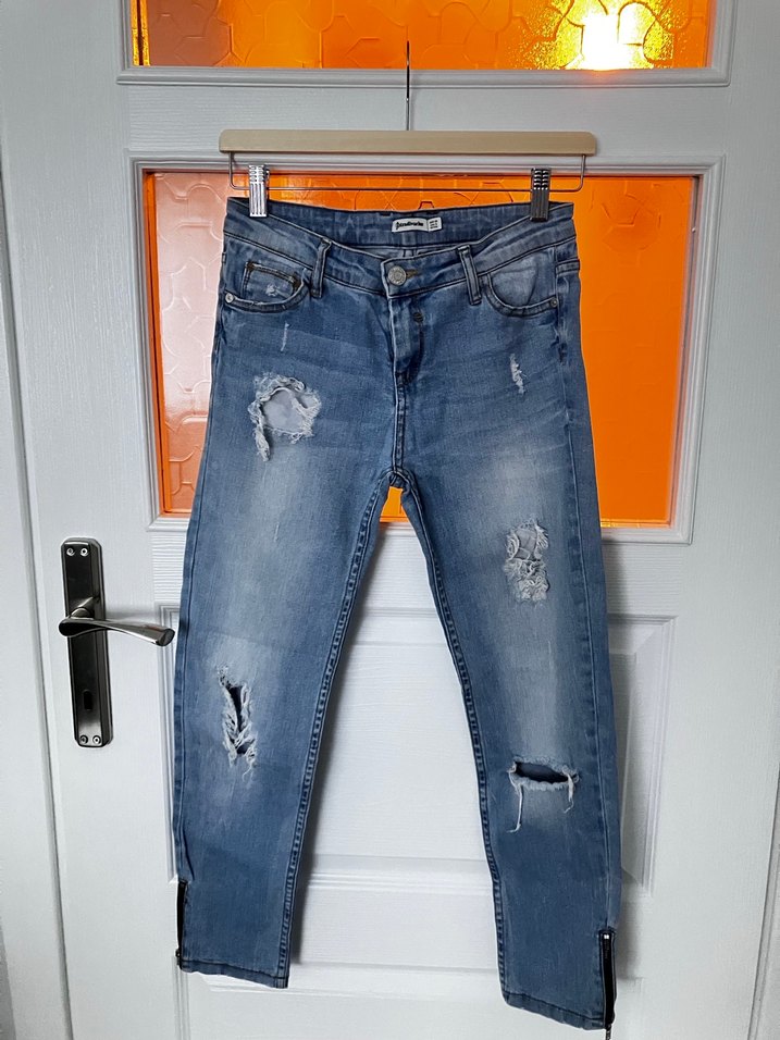 Mavi renkli, yırtık detaylara sahip, orta bel denim jean. Yan paçalarında fermuarlar bulunur, günlük sokak stiline uygundur.