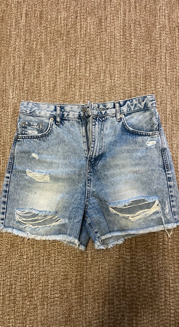 Kadınlar için bol kesim, mavi tie-dye desenli, yırtık detaylı ve tokalı jean şort. Rahat sokak stili için uygundur.