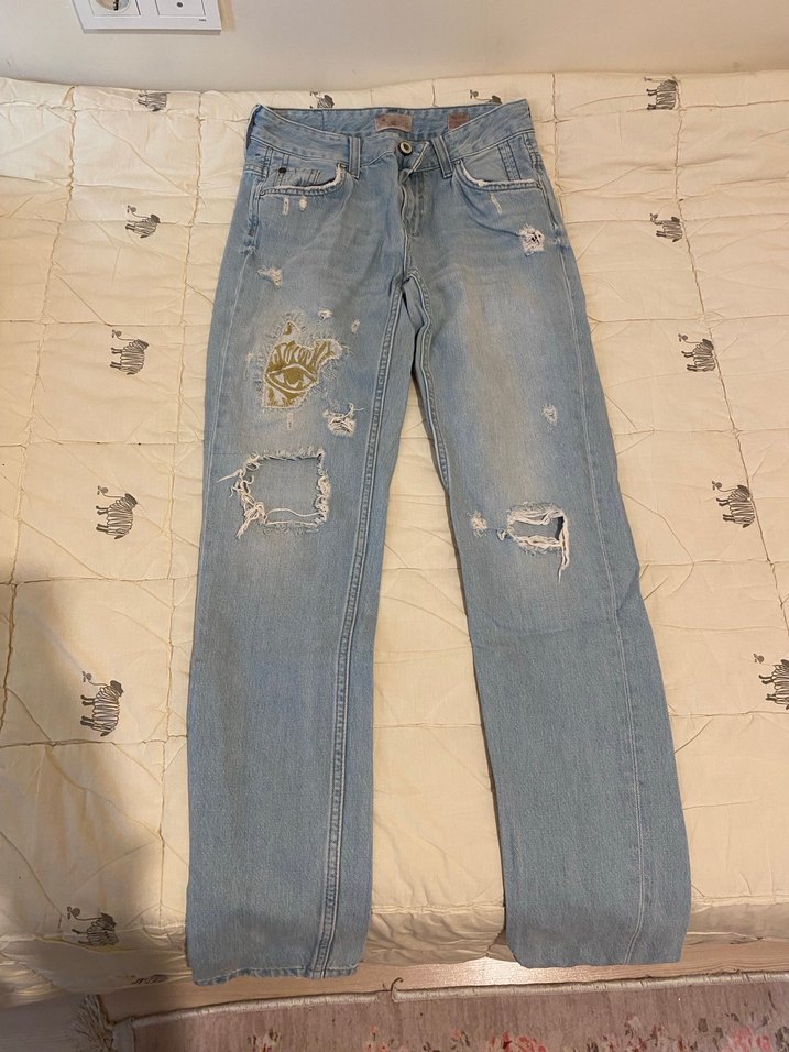Bol kesim, pastel mavi kot pantolon, yırtık detaylı ve tokalı tasarıma sahip, gündelik rahat kullanım için uygundur.