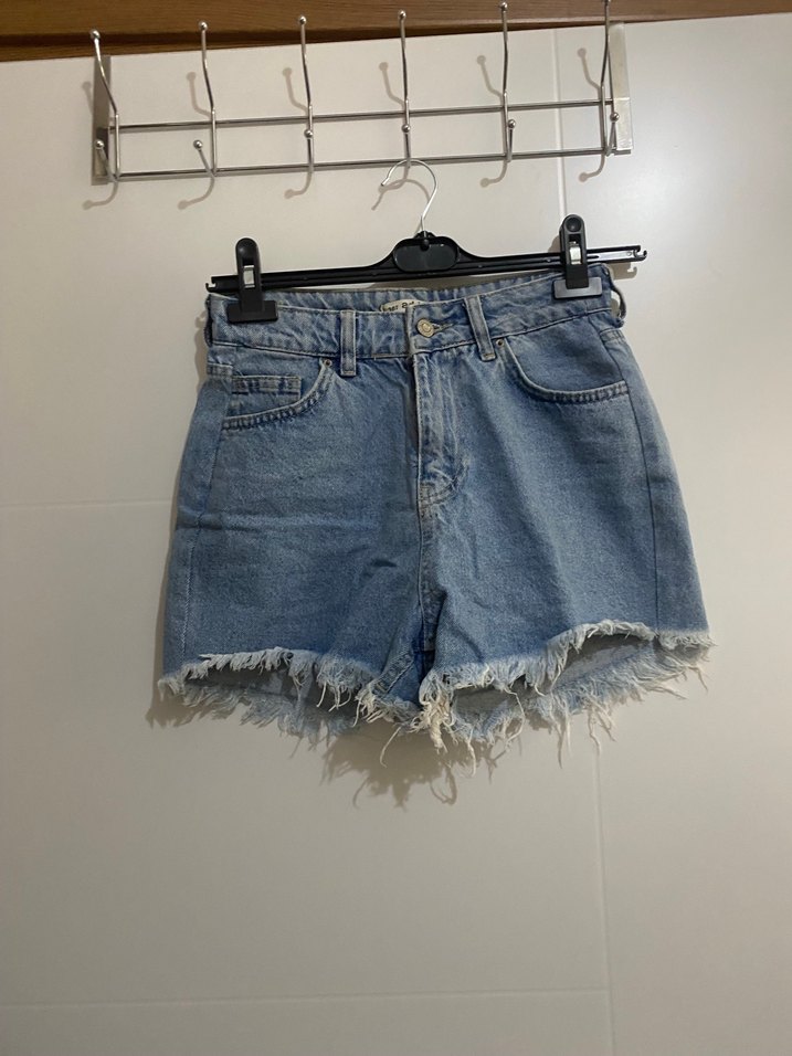 Kadınlar için bol kesim, kemerli ve yırtık kenarlı mavi kot şort. Rahat sokak tarzı için uygun, bağlama desenli.