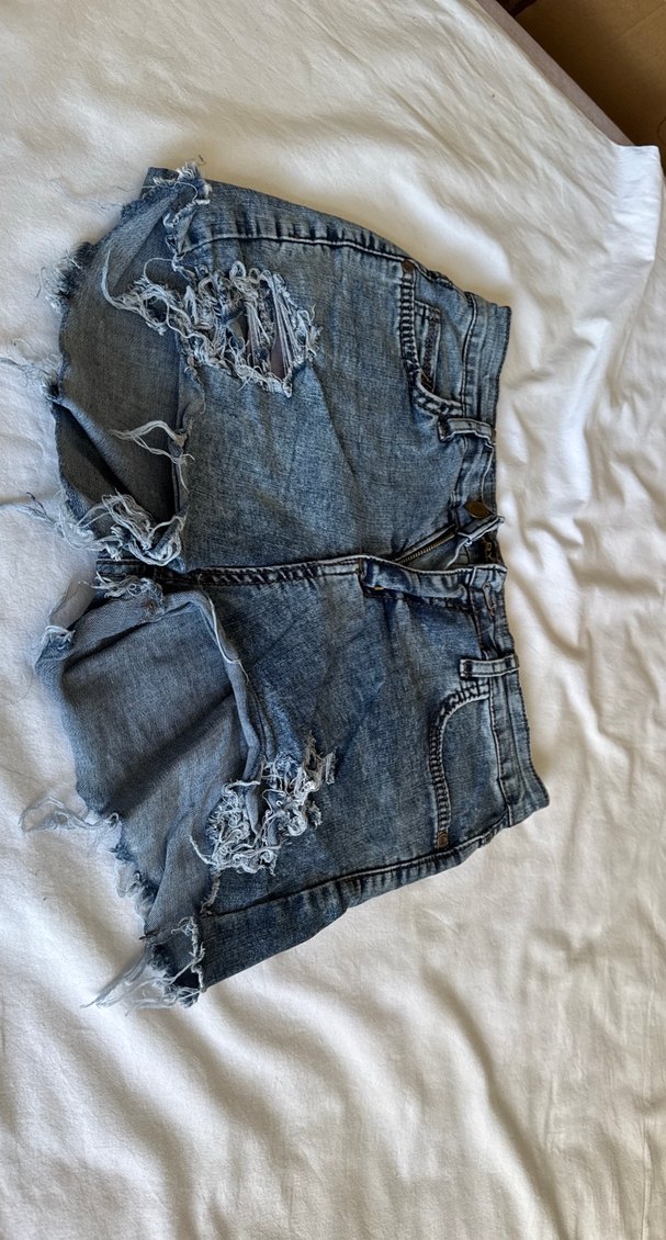 Gevşek kesim, mini boy, yırtık detaylı mavi kot şort. Belinde tokalı, günlük kullanıma uygun sokak stili şort.