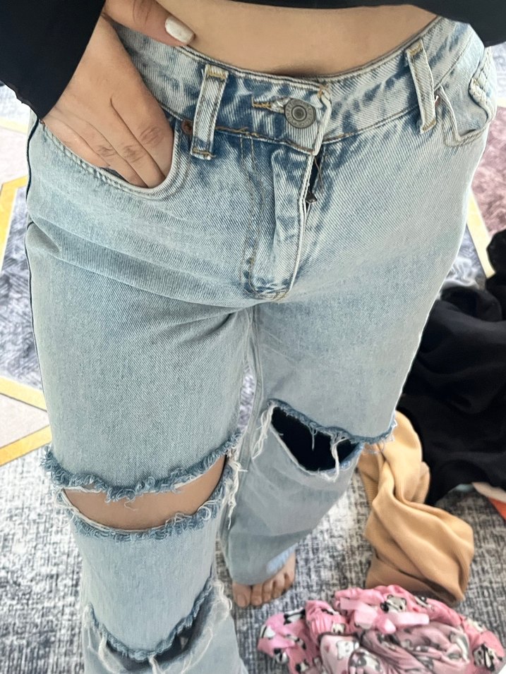 Yırtık detaylı, midi boy, bol kesim kadın kot pantolon, pastel mavi renkte, günlük rahat kullanım için uygun.