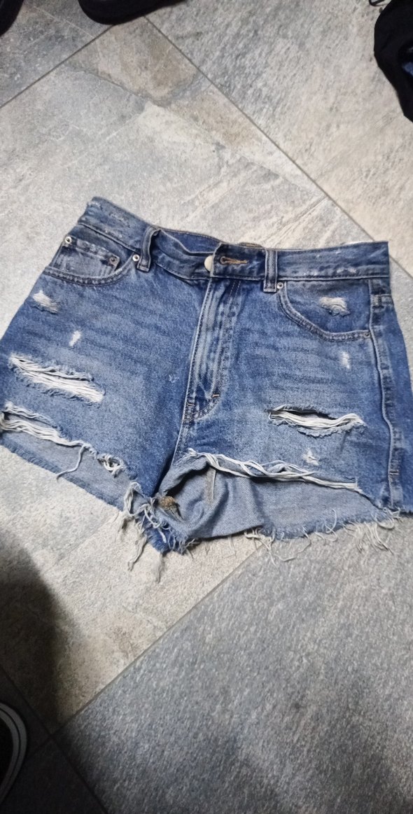 Bol kesim, yırtık detaylı mavi denim mini şort, tokalı ve rahat sokak stiline uygun. Kısa boyda, trend bir görünüm sunar.