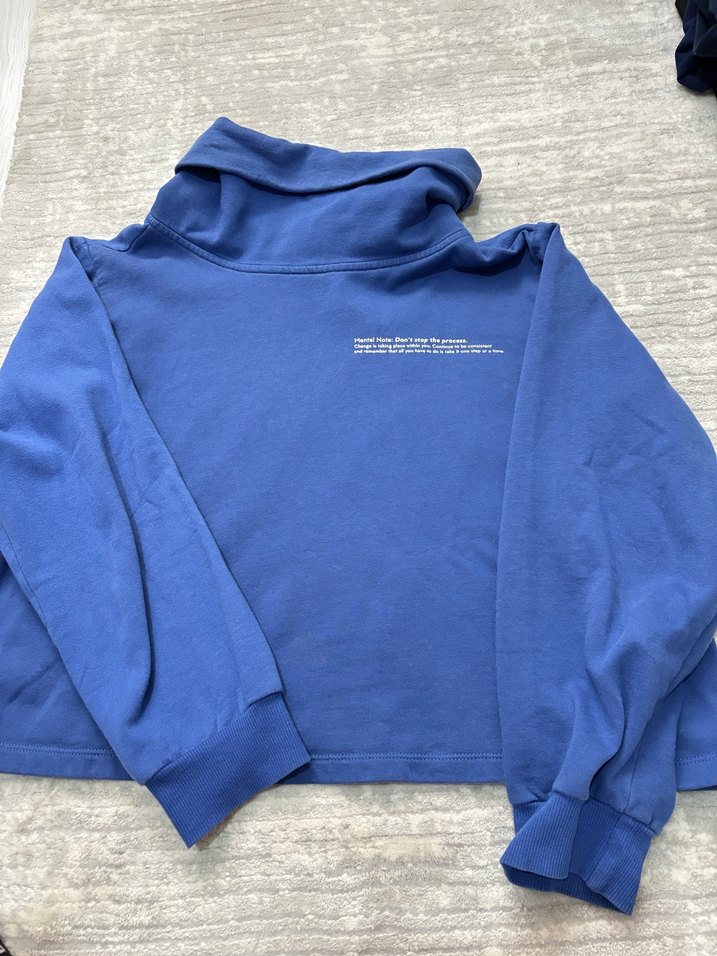 Kadınlar için yüksek yakalı, uzun kollu ve bol kesim mavi sweatshirt. Yumuşak ve sıcak kumaştan, günlük kullanım için uygun sade tasarım ve midi boyda. ✨ Gerçekten birkaç kere giyilmiş durumda defosuz