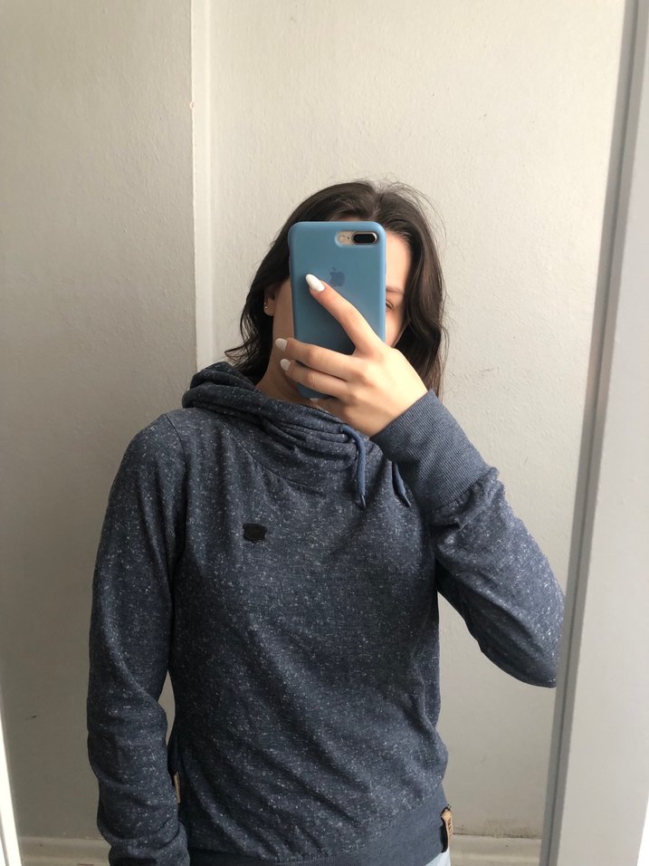 Kadınlar için mavi renkte, yüksek yakalı ve uzun kollu, yumuşak denim kumaştan yapılmış, günlük kullanıma uygun, fitted kesim normcore tarz sweatshirt.
