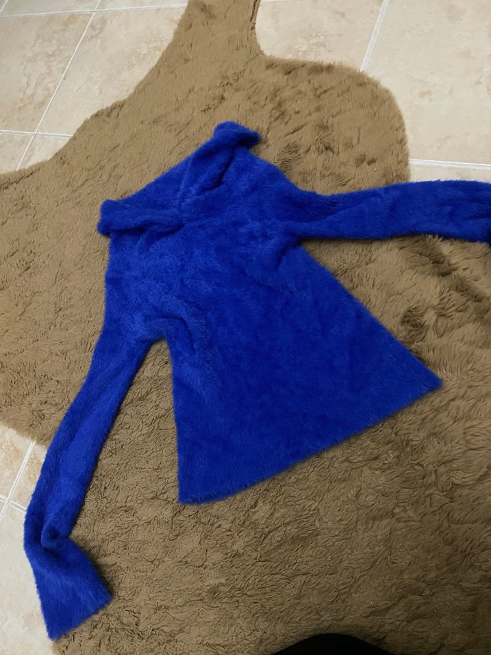 Bu kadın kazak, uzun kollu ve boğazlı olup, yumuşak ve sıcak dokulu tüylü detaylara sahiptir. Koyu mavi renkte ve midi boydadır, günlük kullanım için uygundur.