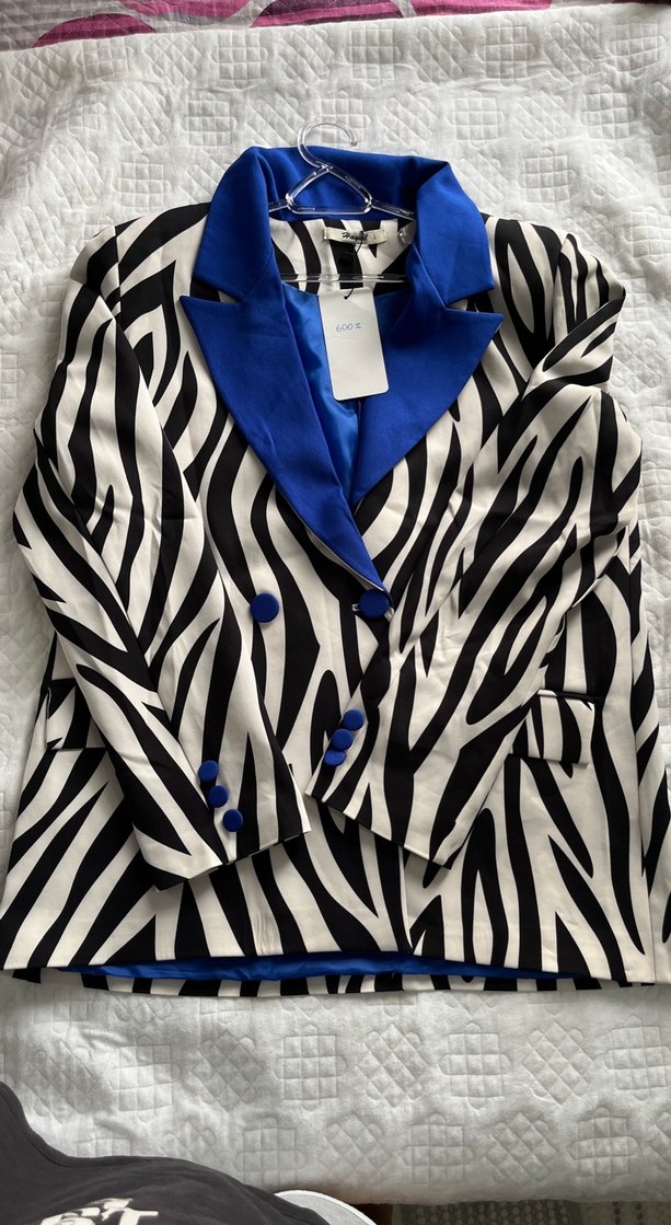 Kadın blazer ceketin zebra deseni, mavi yakası ve düğme detayları vardır. Uzun kollu, normal kesim ve midi boydadır, ofis için uygundur. Hiç kullanılmamıştır.L ve M bedenleri mevcuttur