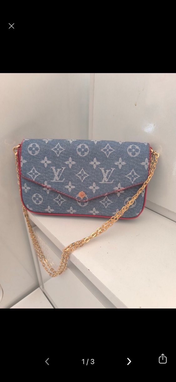 Mavi denim çapraz çanta, baskılı desen ve altın zincir detaylıdır. Gri vurgulu, tokalı ve günlük kullanıma uygun şık bir aksesuardır.