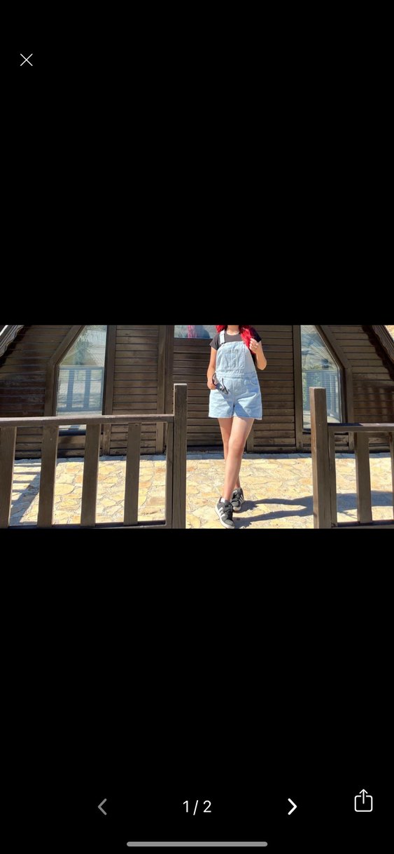 Salaş kesim, askısız kısa denim salopet, trend sokak stili için uygun.