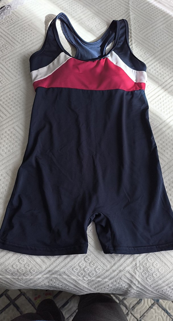 Koyu mavi renkte, kolsuz, belden kemerli, sentetik kumaştan mayo Spor