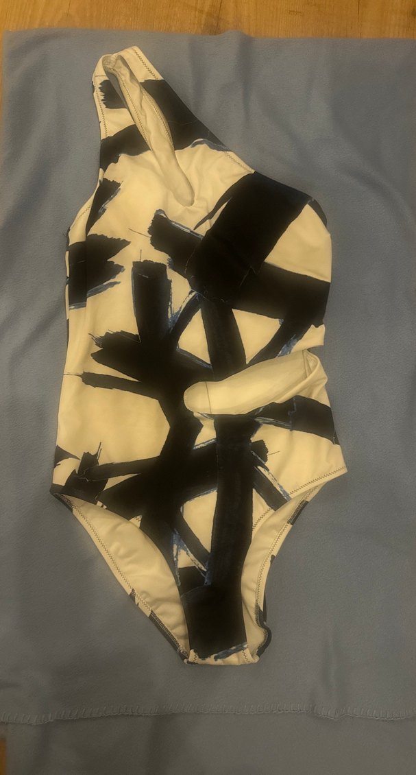 kadın mayo, beyaz mavi desenlerle ve askılı tokalı detaylarla çağdaş avant-garde tarz sunar. ️