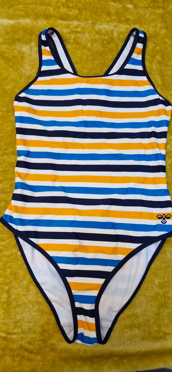 Renkli mavi, sarı ve beyaz yatay çizgili, askılı mayo. Plaj için uygun, sokak giyimi tarzında.