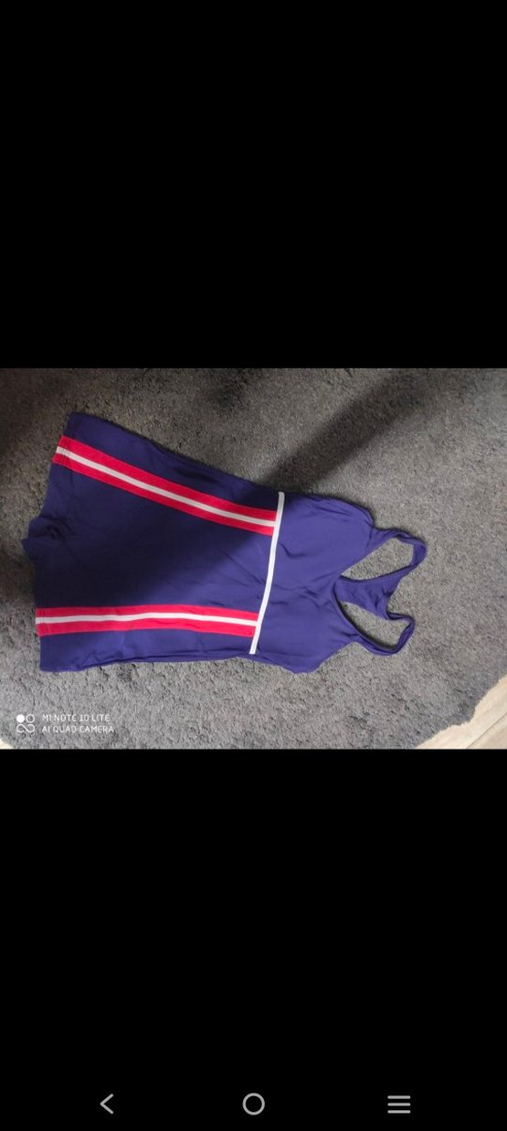 Mor renkte, ince askılı, elastik bantlı ve kırmızı beyaz çizgili spor tarzda kadın mayo. Sadece etiketi yok