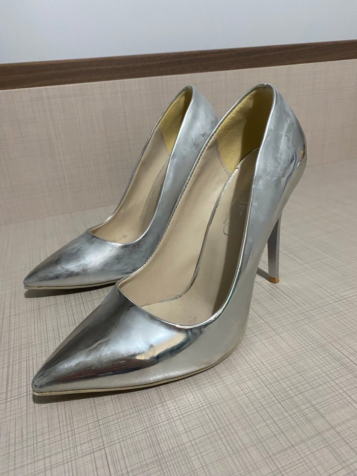 Metallic gri, sivri burunlu ve yüksek topuklu stiletto, klasik ve çağdaş ofis stiline uygun.