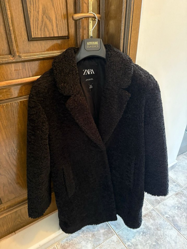 peluş kumaşlı, kürk detaylı kadın midi kaban, uzun kollu, rahat kesim. Sokak modasına uygun, günlük kullanıma ideal. Zara markası.