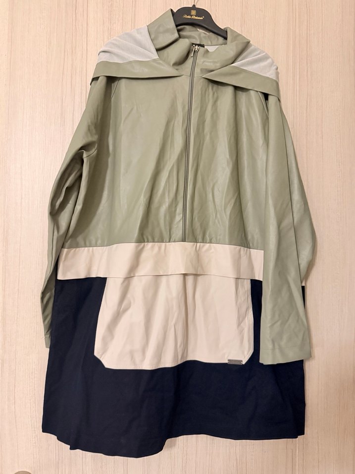 Kadın midi boy, bol kesim, yüksek yakalı ve uzun kollu yağmurluk. Haki, gri ve siyah renk bloklu, günlük sokak stili için uygun. ️
