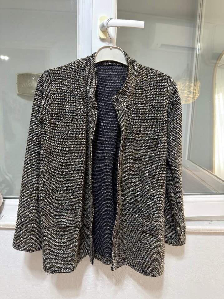 Kadın midi hırka, keten dokuma, cepli ve uzun kollu. Rahat kesimi ve kahverengi-gri tonu ile günlük kullanıma uygundur. 1 defa gıyıldı özel dıkımdir