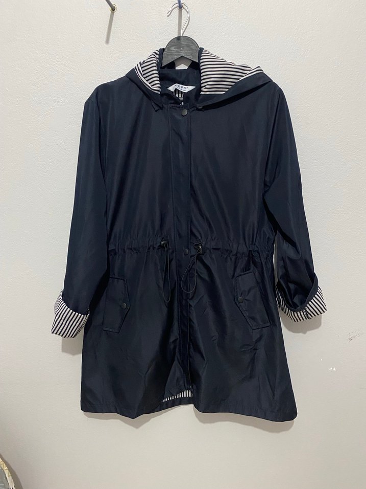 Bu lacivert midi ceket, kemerli bel ve uzun kollu rahat kesime sahiptir. Çizgili kapüşon astarı ve kesik yaka ile Paris sokak stilini yansıtır. Günlük kullanıma uygundur.