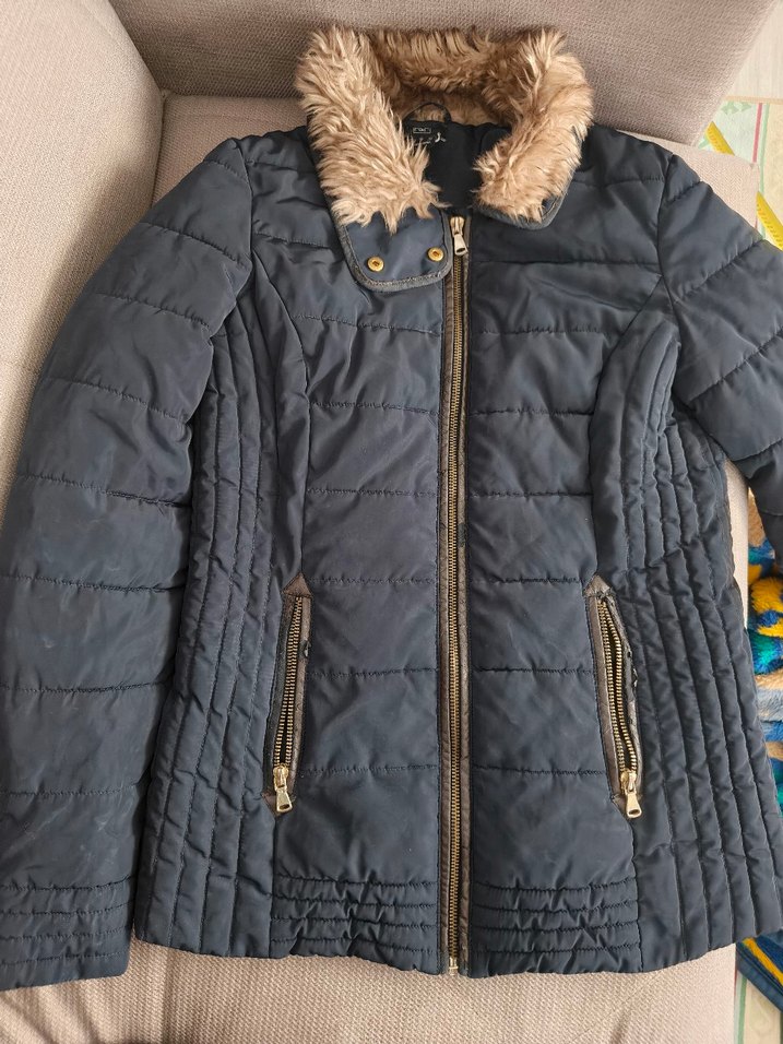 Gri renkli, kürk detaylı, normal uzunlukta, vücuda oturan kadın kışlık mont. İki fermuarlı cep ve yumuşak, sıcak kumaş ile sokak modasına uygun.
