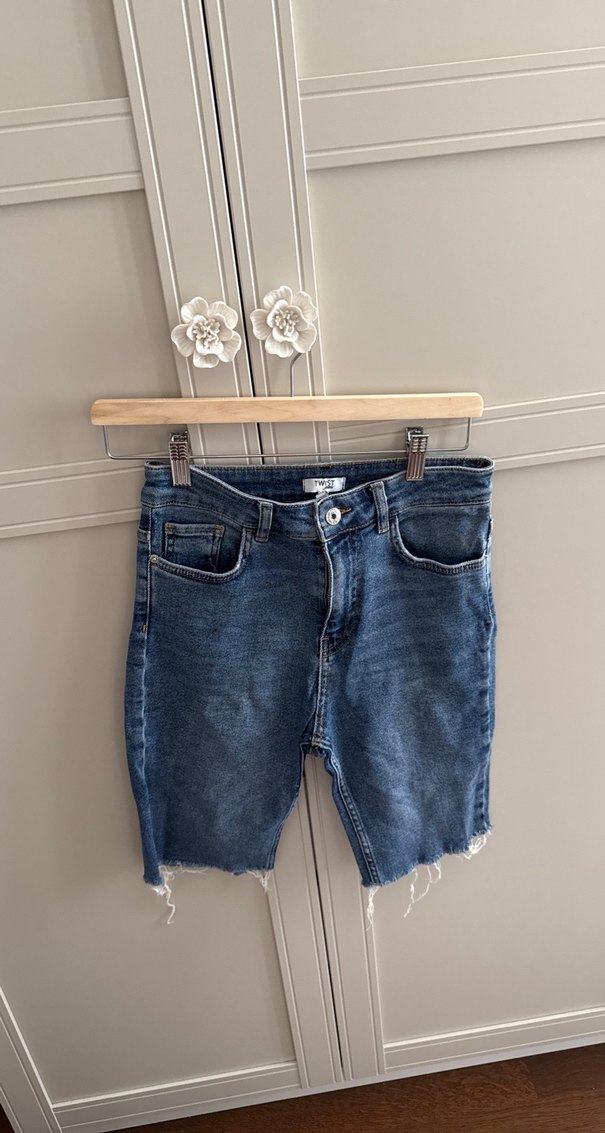 Kadınlar için midi uzunlukta, kemer yerli ve fitted kesim kot şort. Mavi-gri tonlarında, gündelik normcore stilinde şort.